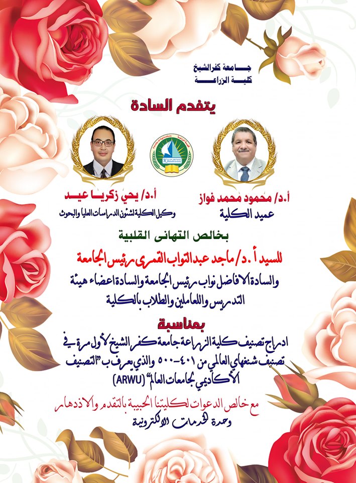 يتقدم أ.د/ محمود فواز عميد الكلية وأ.د/ يحي زكريا وكيل الكلية لشئون الدراسات العليا والبحوث بخالص التهاني القلبية للسادة أعضاء هيئة التدريس والهيئة المعاونه والعاملين بالكلية والطلاب بمناسبة ادراج تصنيف الكلية لاول مرة فى تصنيف شنغهاى العالمى من 401-500 والذى يعرف بالتصنيفالاكاديمى لجامعات العالم (ARWU)
