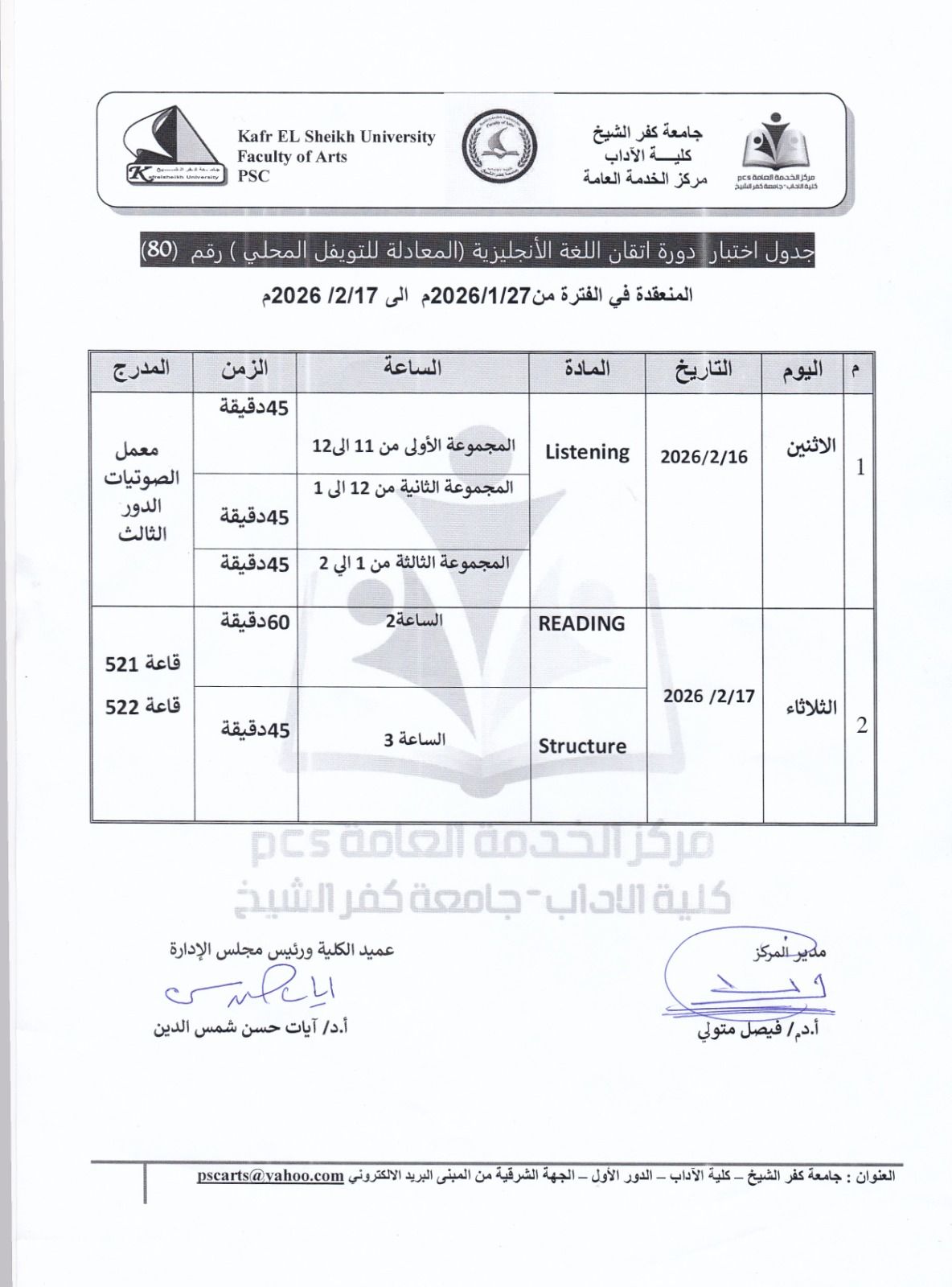 جدول امتحانات دورة اتقان اللغة الإنجليزية (المعادلة للتويفل المحلى) رقم 80