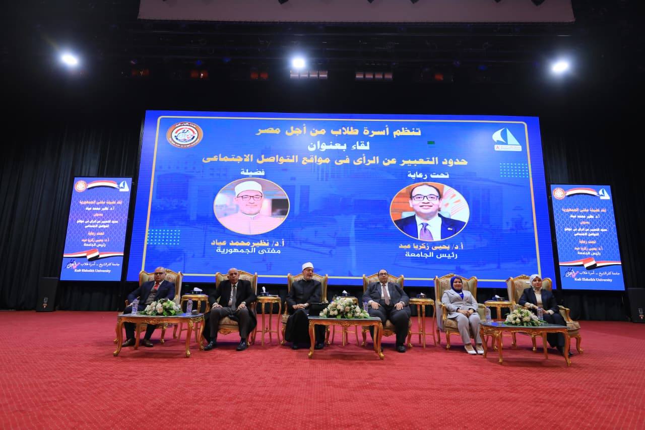 نظمت كلية الآداب بجامعة كفر الشيخ، بالتعاون مع أسرة طلاب «من أجل مصر»، لقاءً فكريًا موسعًا بعنوان «حدود التعبير عن الرأي في مواقع التواصل الاجتماعي»، وذلك ضمن جهود وزارة التعليم العالي والبحث العلمي لتعزيز الوعي الرقمي والمسؤولية الاجتماعية لدى الطلاب. حضر اللقاء فضيلة الدكتور نظير محمد عياد، مفتي جمهورية مصر العربية، والأستاذ الدكتور يحيى زكريا عيد، رئيس الجامعة، إلى جانب اللواء عادل لبيب، وزير التنمية المحلية الأسبق ورئيس مجلس أمناء جامعة كفر الشيخ الأهلية، والأستاذ الدكتور إسماعيل إسماعيل إبراهيم، نائب رئيس الجامعة للدراسات العليا والبحوث، والأستاذة الدكتورة أماني شاكر، نائب رئيس الجامعة لشئون خدمة المجتمع وتنمية البيئة، والدكتور علي صبري، أمين عام الجامعة، والأستاذة الدكتورة آيات حسن شمس الدين، القائم بأعمال عميد كلية الآداب، والأستاذ الدكتور محمد علام، وكيل كلية الآداب لشئون خدمة المجتمع وتنمية البيئة، وأعضاء مجلس أمناء جامعة كفر الشيخ الأهلية، وعمداء ووكلاء الكليات وأعضاء هيئة التدريس والطلاب، في مشهدٍ يعكس اهتمام الجامعة بقضايا الوعي المجتمعي والفكري لدى طلابها.