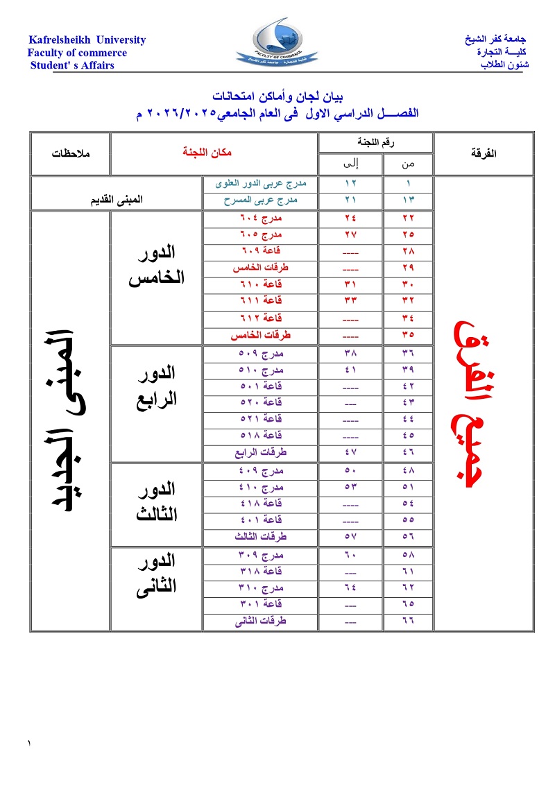أرقام الجلوس و أماكن اللجان الخاصة بامتحانات الفصل الدراسي الاول لعام 2025– 2026جميع الفرق