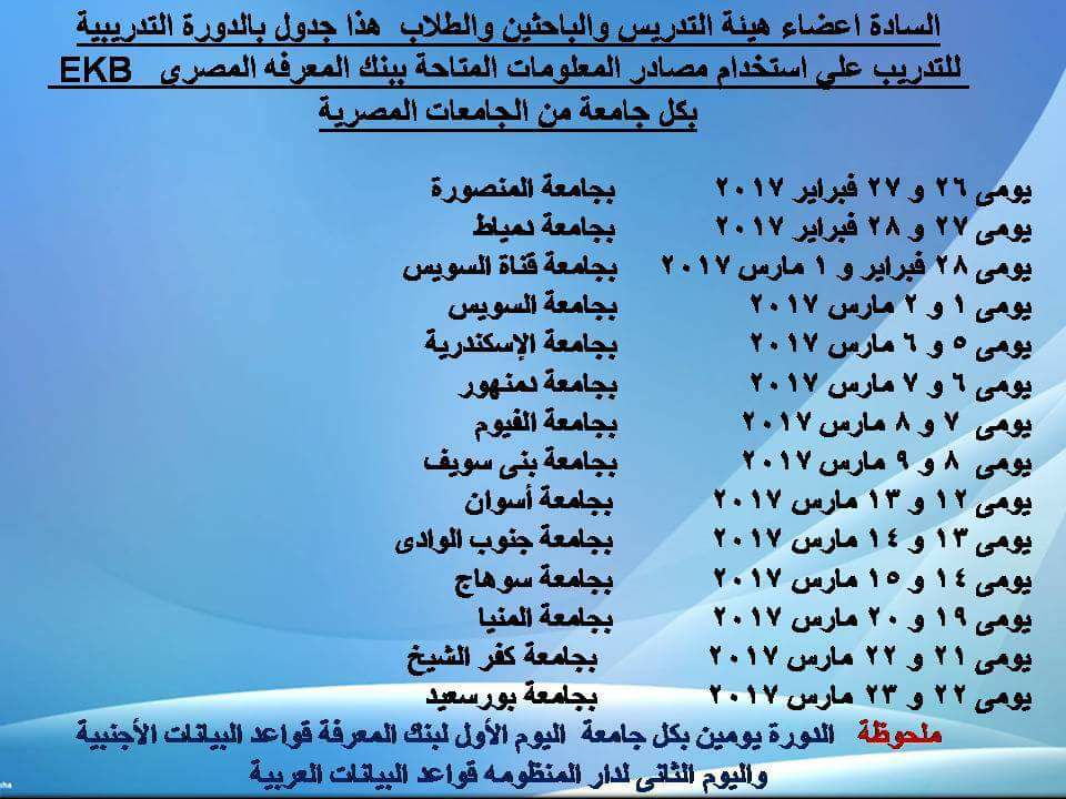 مواعيد التدريب علي مصادر المعلومات المتاحه ببنك المعرفه المصري بالجامعات المصريه