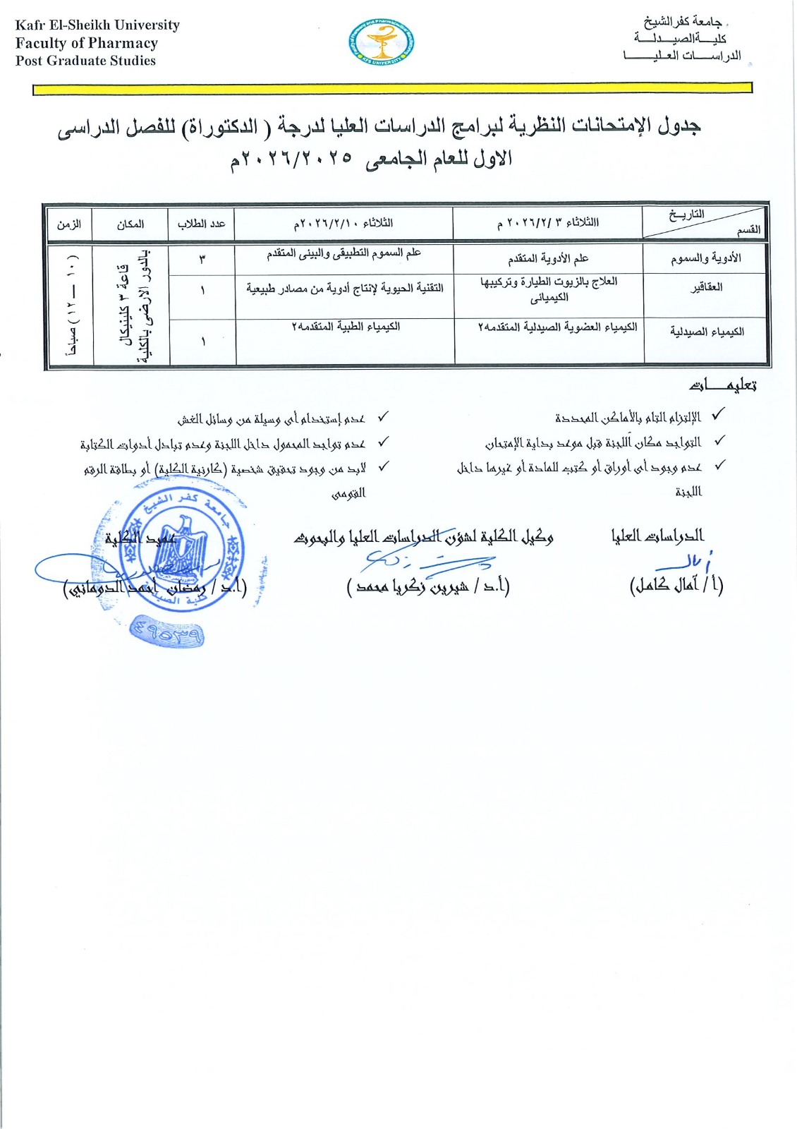 جدول الإمتحانات النظرية لبرامج الدراسات العليا لدرجة ( الدكتوراه ) للفصل الدراسى الأول للعام الجامعى 2025/2026م