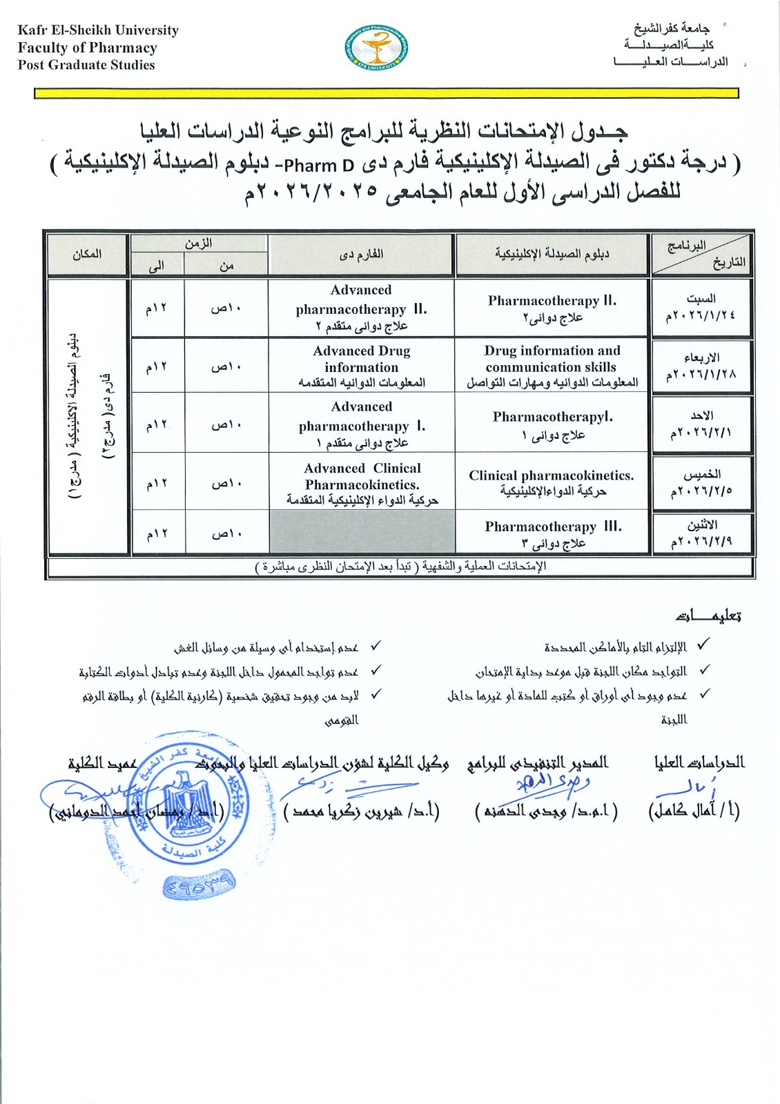 جدول الإمتحانات النظرية لبرامج الدراسات العليا لدرجة ( درجة دكتور فى الصيدلة الإكلينيكية Pharm D – دبلوم الصيدلة الإكلينيكية ) للفصل الدراسى الأول للعام الجامعى 2025/2026م