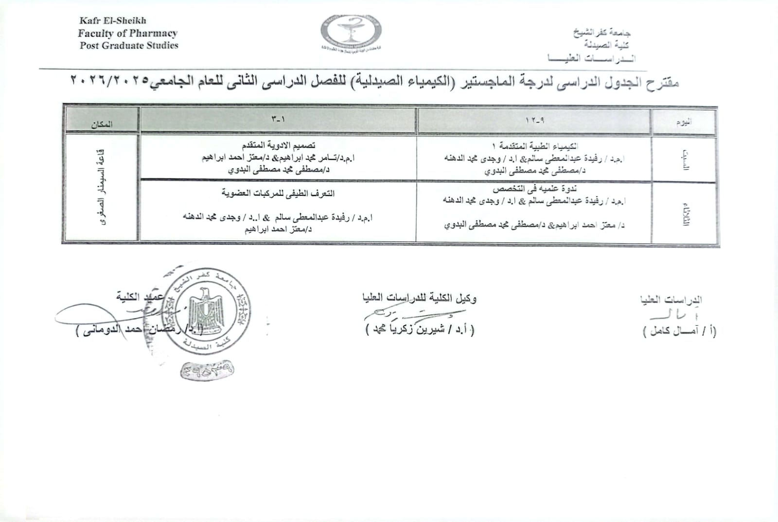 مقترح الجدول الدراسى لدرجة الماجستير ( الكيمياء الصيدلية ) للفصل الدراسى الثانى للعام الجامعى 2025/2026م