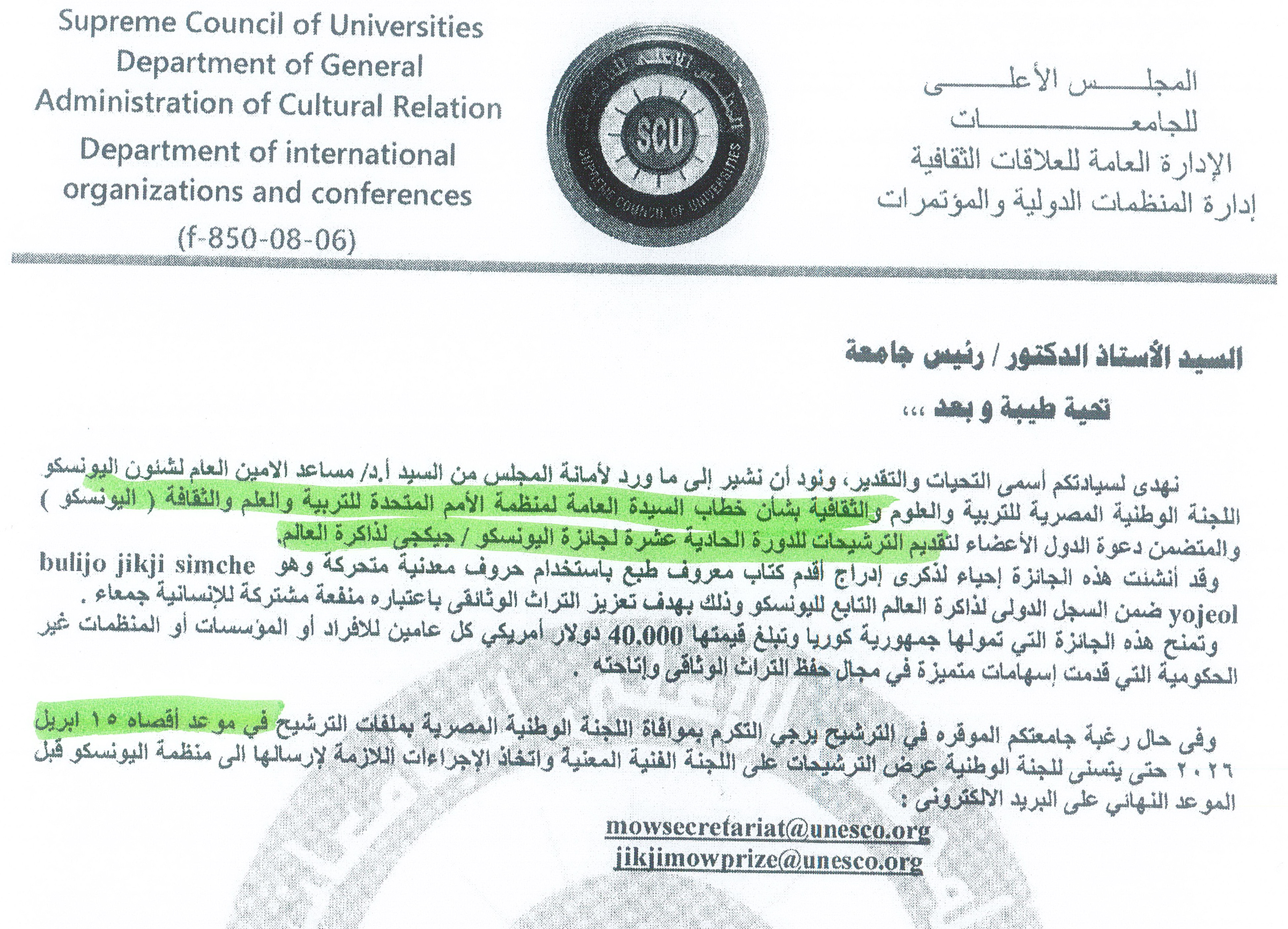 كتاب السيد أ.د/ مساعد الامين العام لشئون اليونسكو اللجنة الوطنية المصرية للتربية والعلوم والثقافية بشأن خطاب السيدة العامة لمنظمة الأمم المتحدة للتربية والعلم والثقافة (اليونسكو) والمتضمن دعوة الدول الأعضاء لتقديم الترشيحات للدورة الحادية عشرة لجائزة اليونسكو/ والمتضمن دعوة الدول الأعضاء لتقديم الترشيحات للدورة الحادية عشرة لجائزة اليونسكو / جيكجي لذاكرة العالم.