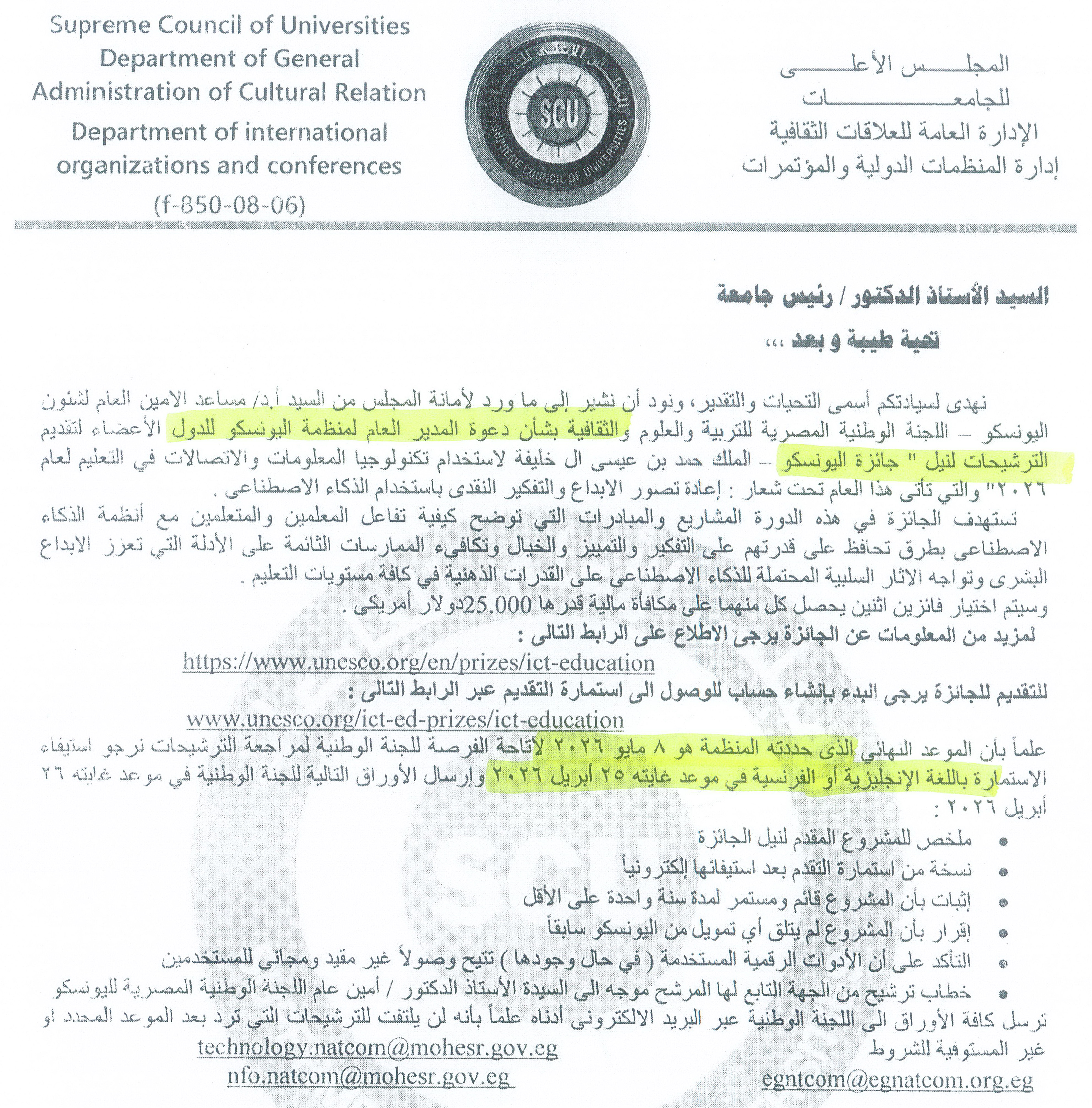 دعوة المدير العام لمنظمة اليونسكو للدول الأعضاء لتقديم الترشيحات لنيل جائزة اليونسكو - الملك حمد بن عيسى الــ خليفة لاستخدام تكنولوجيا المعلومات والاتصالات في التعليم لعام ٢٠٢٦م