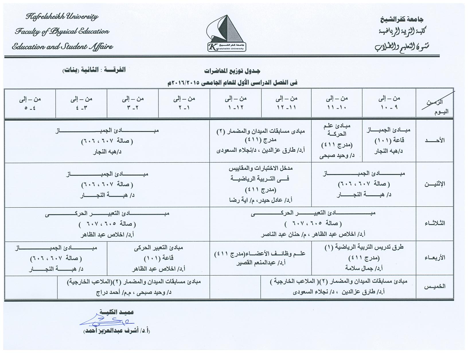 الجدول الدراسى للفرقة الثانية (بنات) للفصل الدراسى الأول للعام الجامعى 2015/2016م