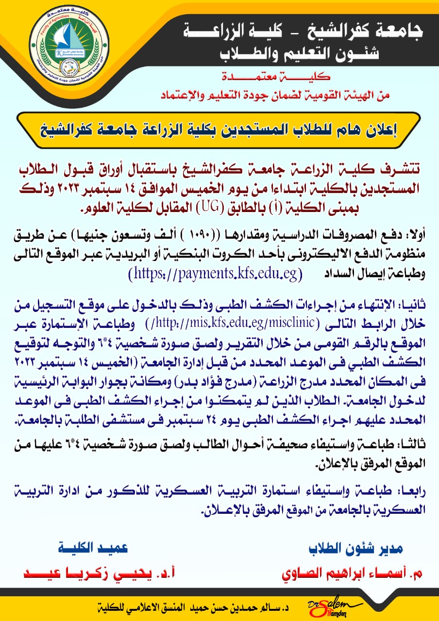 تتشرف كلية الزراعة جامعة كفرالشيخ باستقبال أوراق قبول الطلاب المستجدين بالكلية ابتداءا من يوم الخميس الموافق 14 سبتمبر 2023 وذلك بمبنى الكلية (أ) بالطابق (UG) المقابل لكلية العلوم.