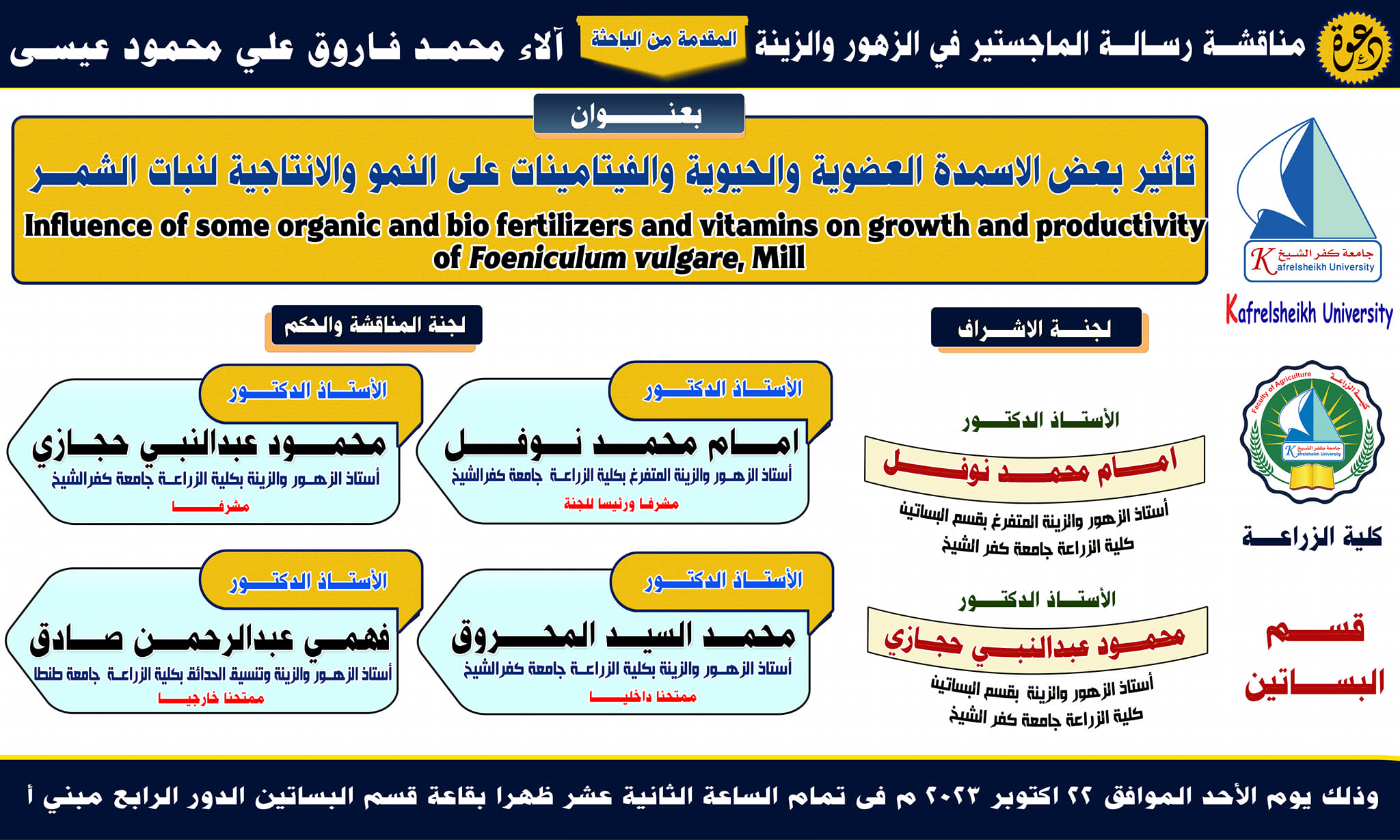 دعوة عامة لحضور مناقشة رسالة ماجستير بقسم الزهور والزينه للباحثة آلاء محمد