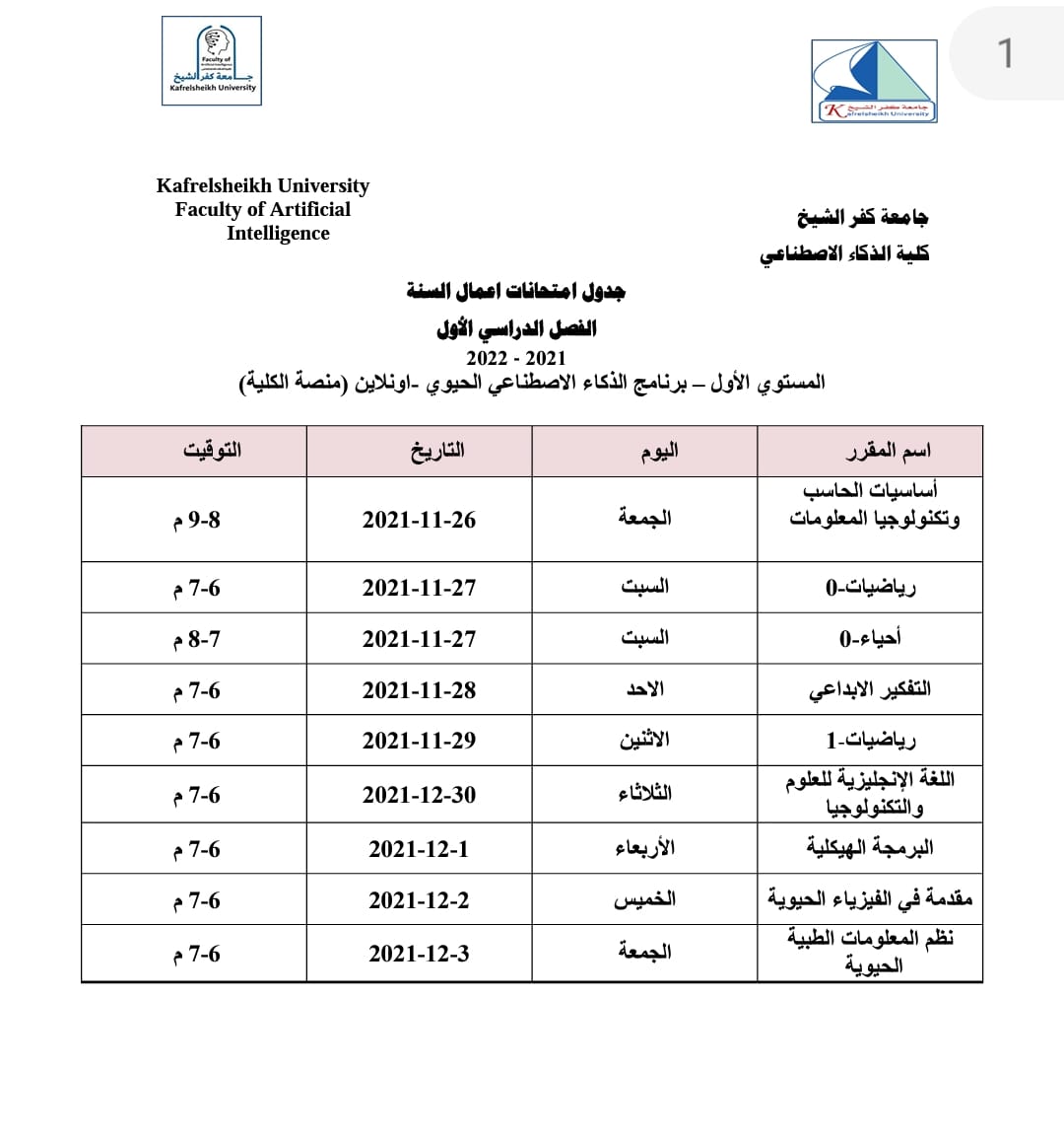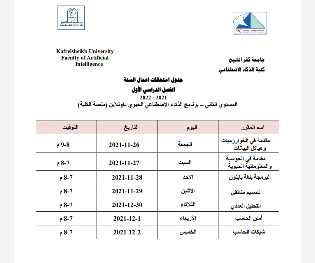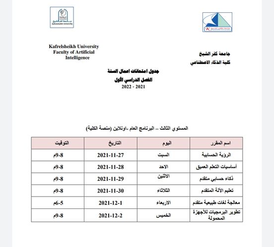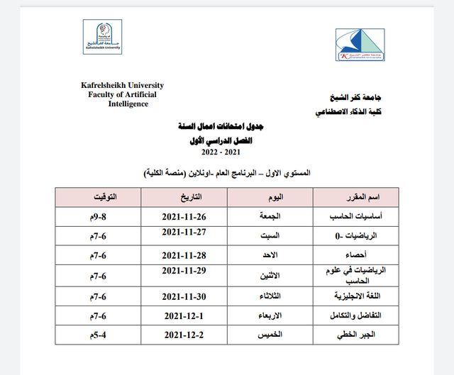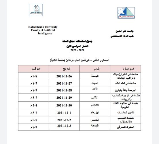 جدول إمتحانات أعمال السنه لكلية الذكاء الاصطناعي الفصل الدراسي الأول للعام الجامعي 2021/2022م