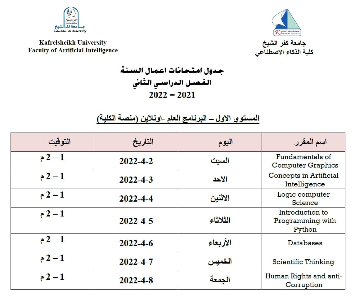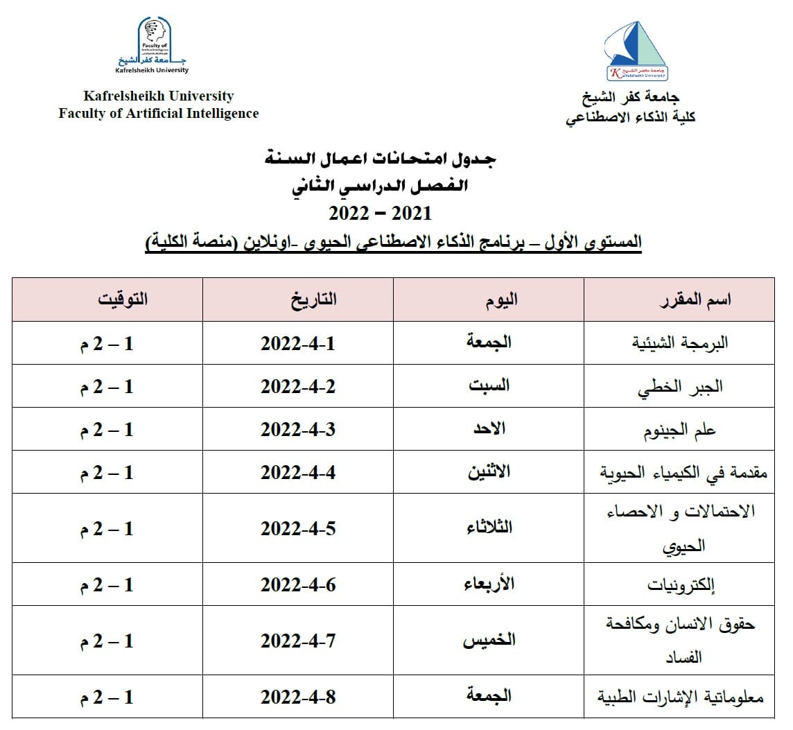 -جدول امتحانات المستوى الأول – برنامج الذكاء الاصطناعى الحيوي