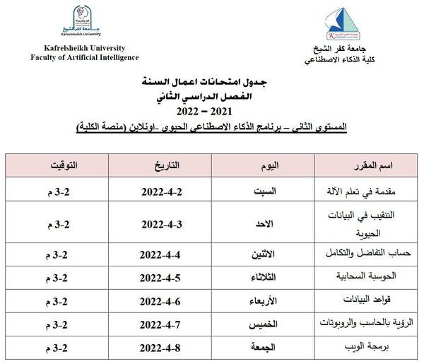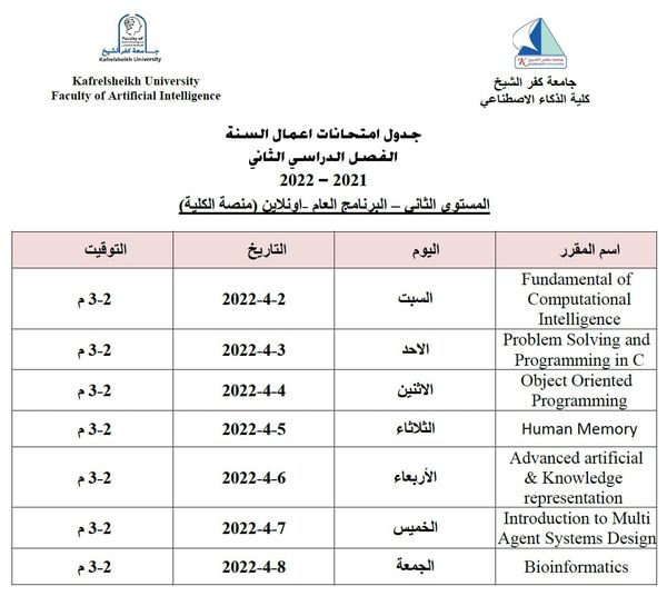 -جدول امتحانات المستوى الثانى – برنامج الذكاء الاصطناعى الحيوي