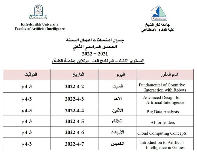 جدول امتحانات أعمال السنة – كلية الذكاء الاصطناعى