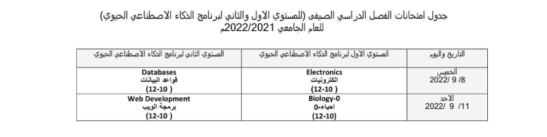 جدول إمتحانات الفصل الدراسي الصيفي للمستوي. (الاول -الثاني ) برنامج الذكاء الاصطناعي الحيوي. للعام الجامعي 2021/2022م