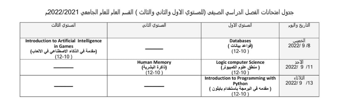 جدول إمتحانات الفصل الدراسي الصيفي للمستوي. (الاول -الثاني- الثالث) القسم العام للعام الجامعي 2021/2022م