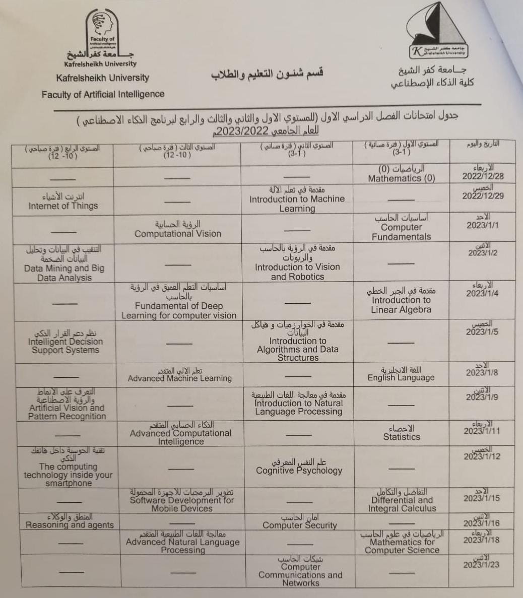 جدول إمتحانات الفصل الدراسى الأول للعام الجامعى 2022-2023 م – القسم العام