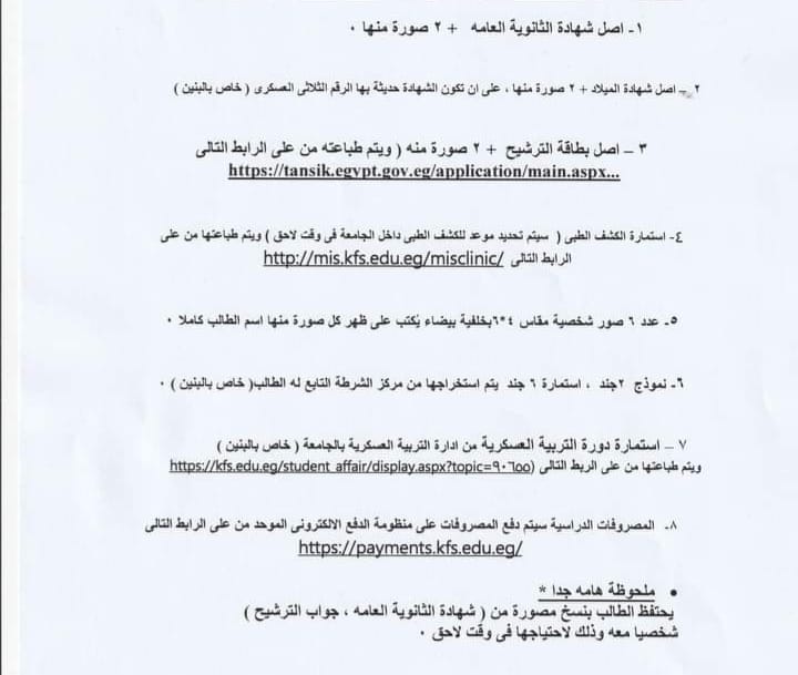 الاوراق المطلوبة من الطلاب المرشحين للكلية (الفرقة الأولى) للعام الجامعى 2023/2024م