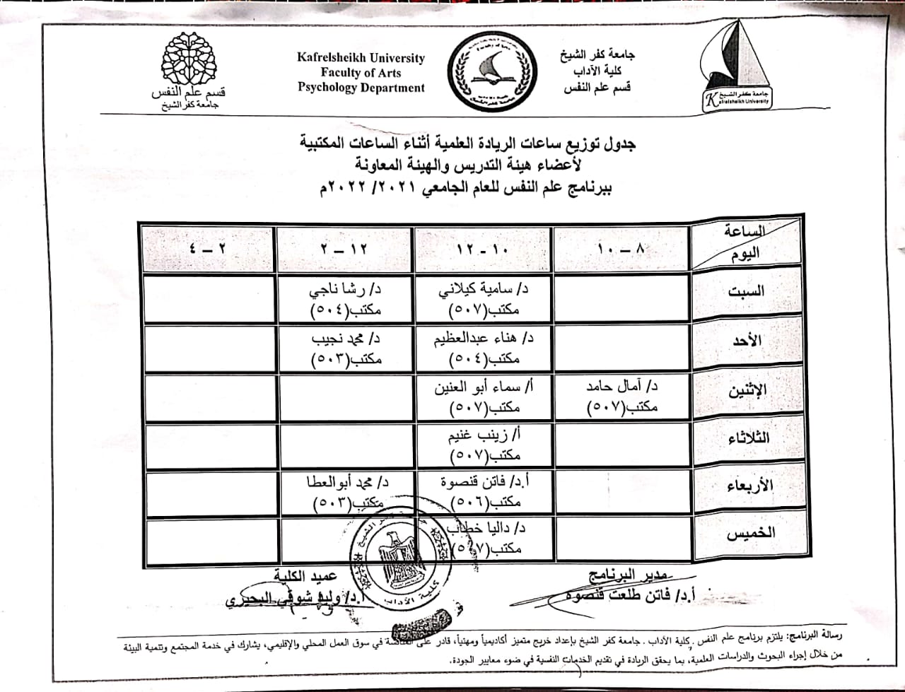 جدول توزيع ساعات الريادة العلمية أثناء الساعات المكتبية
