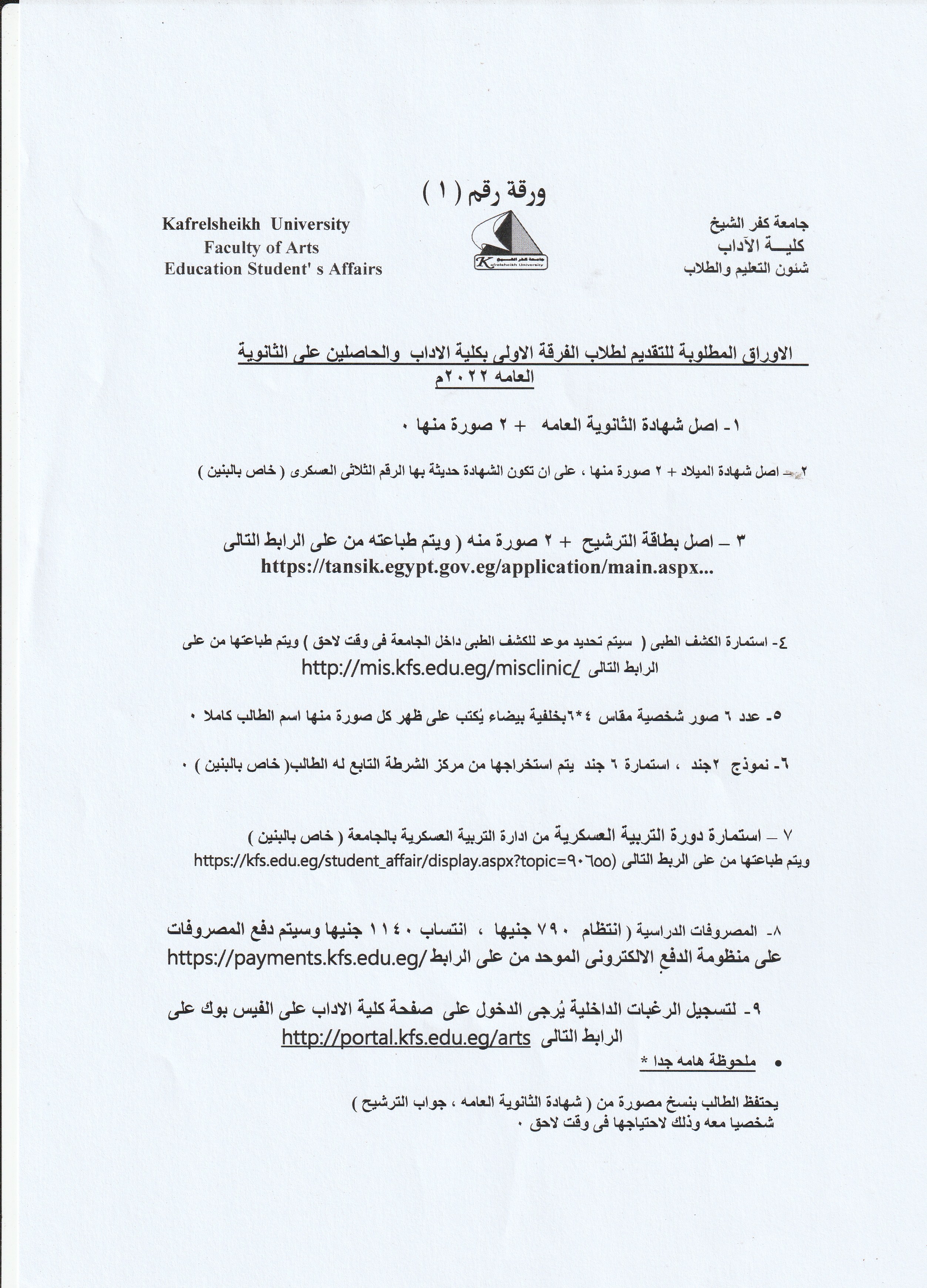 تعلن كلية الآداب عن بدء تلقى اوراق الطلاب المرشحين للكلية (الفرقة الأولى) للعام الجامعى 2022/2023م، بداية من يوم الاحد الموافق 18/9/2022م.