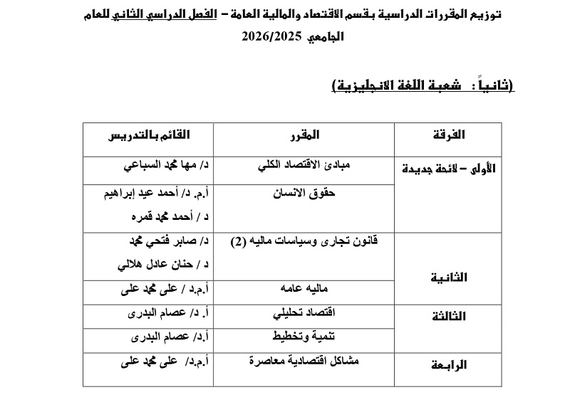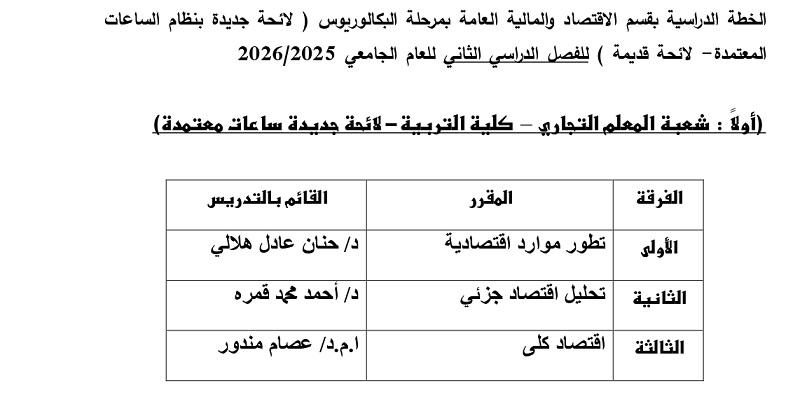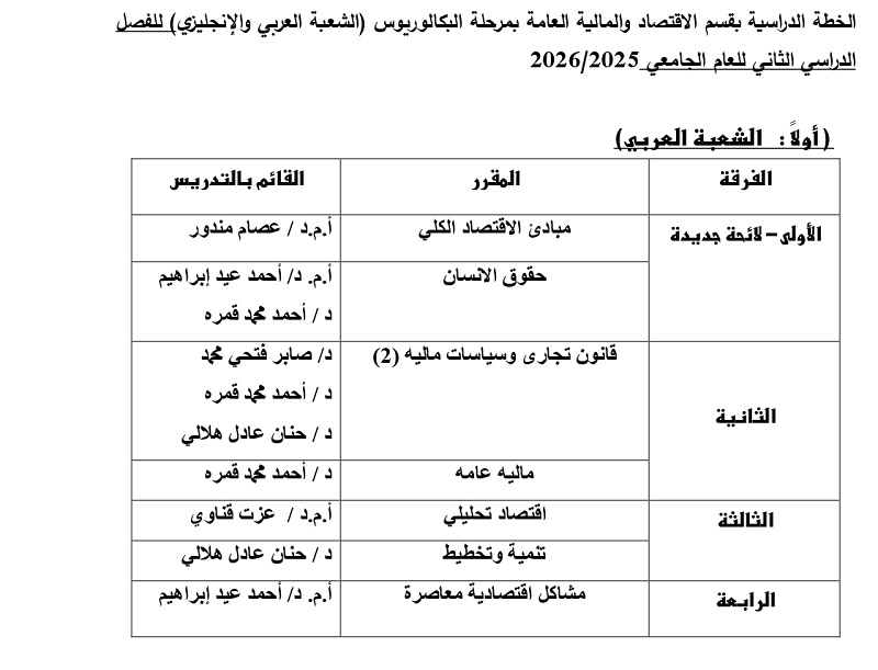 الخطة الدراسية لقسم الاقتصاد والمالية العامة