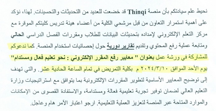 دعوة لحضور ورشة عمل معايير رفع المقرر الالكتروني نحو تعليم فعال و مستدام