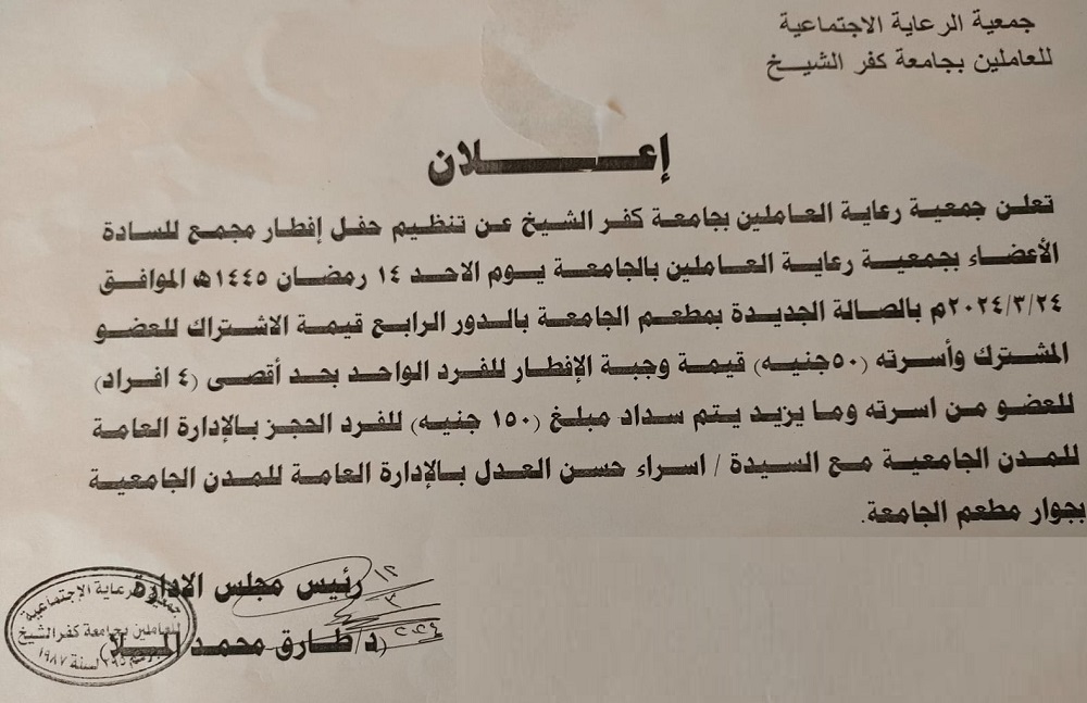 دعوة لحضور افطار مجمع لأعضاء جمعية رعاية العاملين بالجامعة