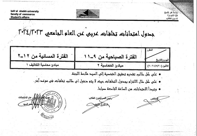 كشوف تخلفات وارقام الجلوس ومكان امتحان مادتى _ مبادئ محاسبة ٢ _ مبادئ محاسبة تكاليف ١ والمزمع عقدها يوم الاثنين الموافق ٢٠٢٤/٥/٢٠