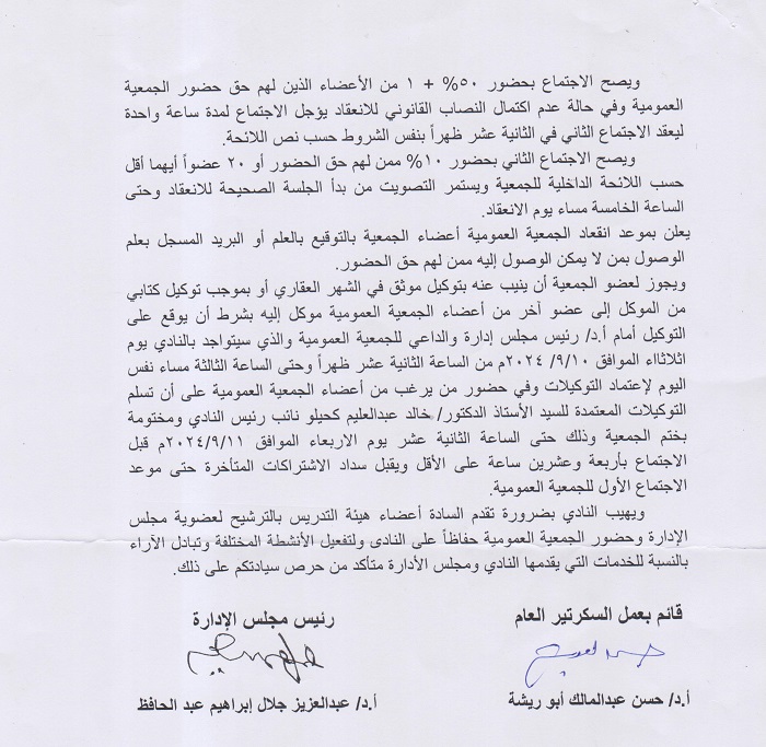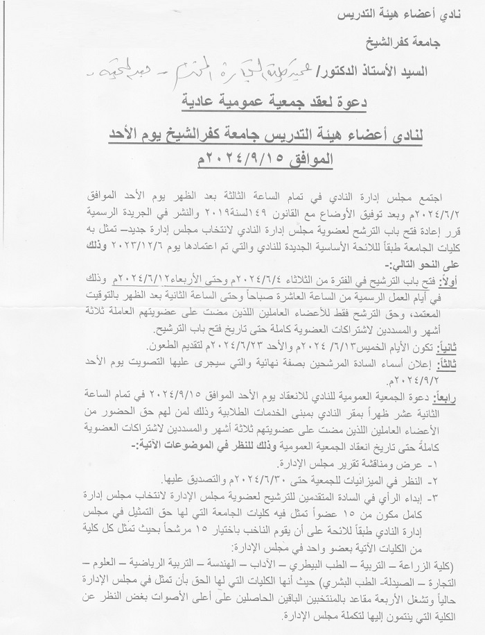 دعوة لعقد الجمعية العمومية لنادي اعضاء هيئة التدريس بجامعة كفر الشيخ