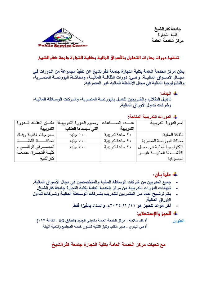 تنفيذ دورات مهارات التعامل بالأسواق المالية بكلية التجارة جامعة كفرالشيخ
