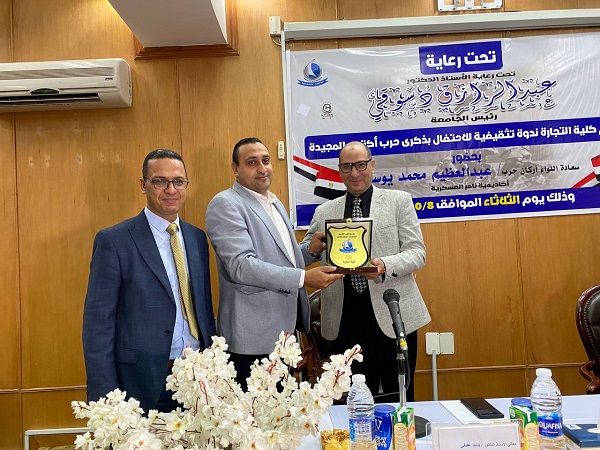 كما أكد سعادة الأستاذ الدكتور/ وليد عفيفي عميد كلية التجارة أن الاحتفال يذكرنا بما حققه جيل أكتوبر العظيم، الذي استطاع تحطيم أسطورة جيش الاحتلال الإسرائيلي الذي لا يقهر، ورفع راية الوطن على ترابه المقدس، وأعاد للعسكرية المصرية الكبرياء والشموخ، حين عبر عشرات الآلاف من أبطال القوات المسلحة، يوم 6 أكتوبر عام 1973، إلى الضفة الشرقية لقناة السويس، لاستعادة أغلى بقعة في الوطن هي سيناء، واستعاد المصريون معها كرامتهم واحترام العالم. كما لا تزال حرب أكتوبر المجيدة ملحمة وطنية مصرية متكاملة، عادت فيها أرض سيناء الحبيبة إلى وطنها الأم، وتجمعت فيها كل المبادئ الوطنية والقيم السامية وأسس النجاح والتميز، من إرادة حديدية وإيمان بالله وثقة في النصر والانتماء والولاء للوطن.