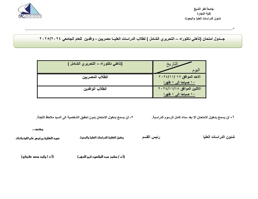 جـــدول امتحان (تأهلي دكتوراه – التحريري الشامل ) لطلاب الدراسات العليــا مصريين - وافدين للعام الجامعي 2024/2025