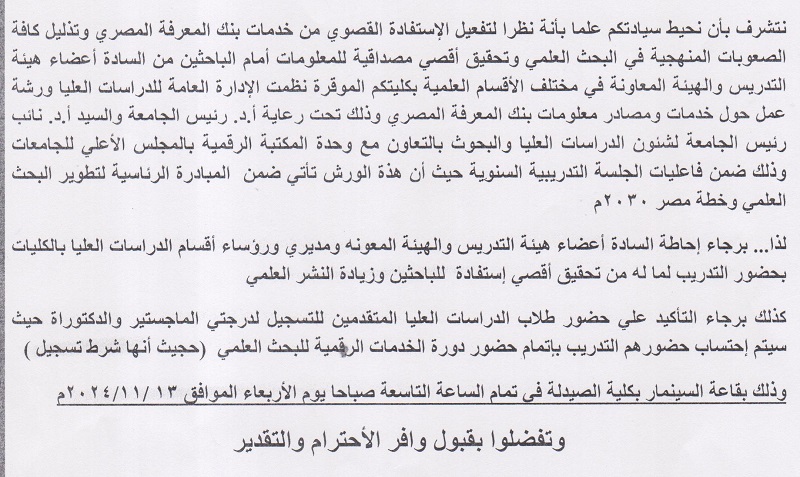 دعوة لحضور ورشة عمل حول خدمات و مصادر بنك المعرفة المصري