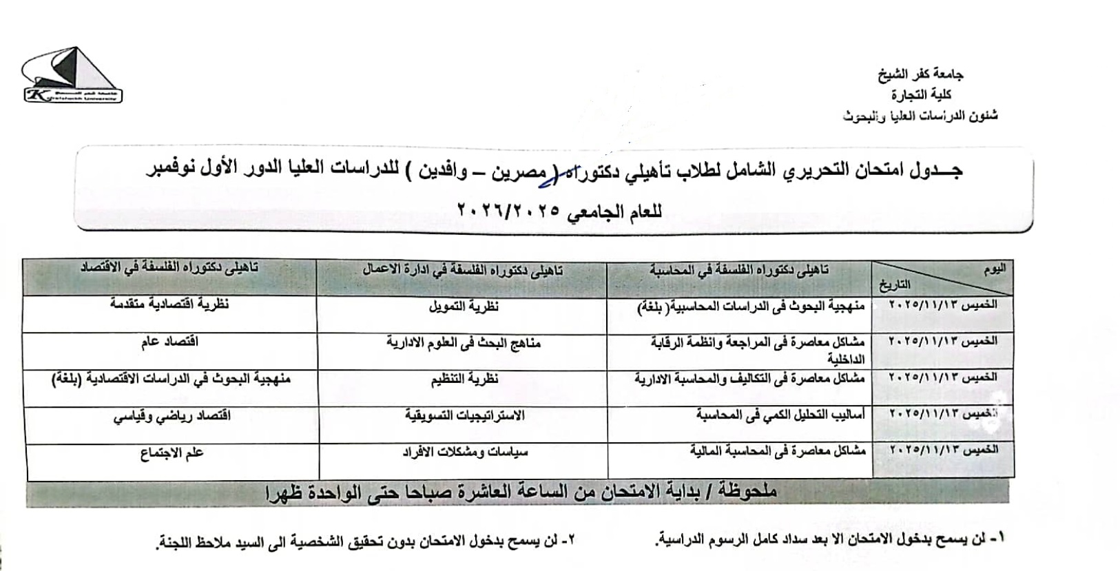 جدول امتحان التحريري الشامل لطلاب تأهيلي دكتوراه (مصريين - وافدين ) للدراسات العليا الدور الاول نوفمبر للعام الجامعي 2025-2026