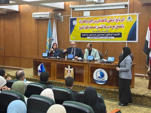 والأستاذ أشرف عامر -أمين الكلية تم تنفيذ الندوة التثقيفيه لمكافحة الإيدز ضمن البرنامج الوطني لمكافحة الإيدز والمخدرات بالتعاون مع مديرية الشؤون الصحية بكفرالشيخ وقد أكد الأستاذ الدكتور وليد محمد عفيفي عميد الكليه علي اهميه الوعي والتثقيف الصحي للطلاب للوقايه من المخدرات التي تدمر الطلاب الذين هم عماد الامه مشددا علي الالتزام بالاداب العامه للكليه