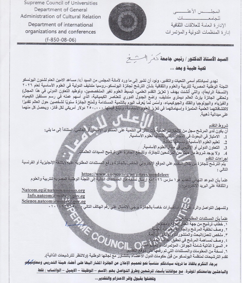 قتح باب الترشح لجائزة اليونيسكو- روسيا مندليف الدولية في العلوم الأساسية لعام 2026