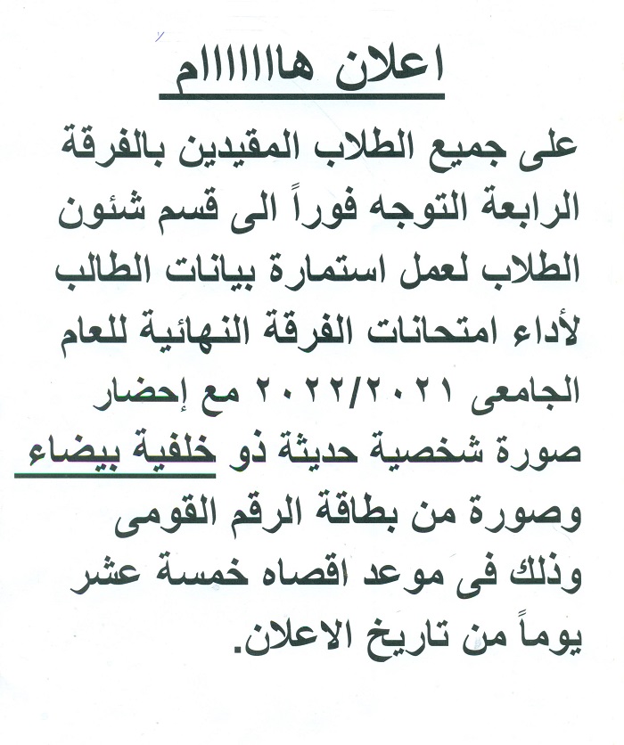 إعلان هام لطلاب الفرقة الرابعة بالكلية