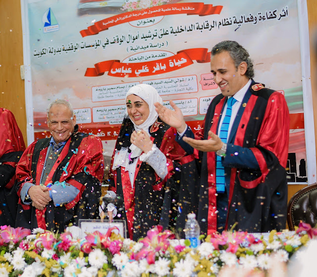 حصلت الباحثة حياة باقر على عباس علي درجة الدكتوراة المهنية فى المحاسبة من كلية التجارة جامعة كفر الشيخ،وذلك عن رسالة أعدتها بعنوان"أثر كفاءة وفعالية نظام الرقابة الداخلية على ترشيد أموال الوقف فى المؤسسات الوقفية بدولة الكويت".