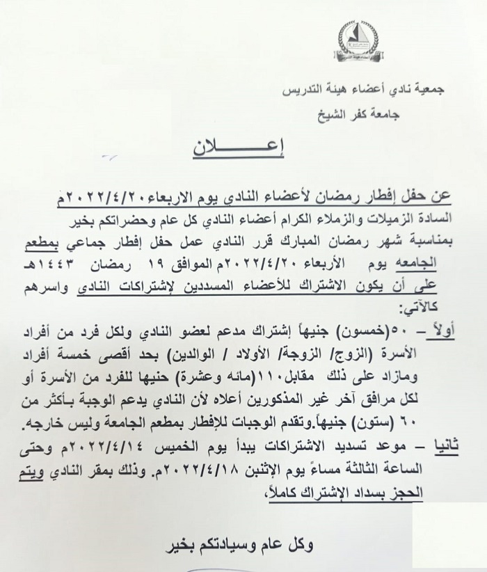 دعوة لحضور افطار جماعي بنادي أعضاء هيئة التدريس جامعة كفر الشيخ