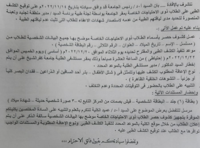 على جميع الطلاب ذوى الإعاقة (الذكور) المقيدين بجميع الفرق الدراسية بالكلية التوجه لقسم شئون الطلاب بالكلية للضرورة القصوى
