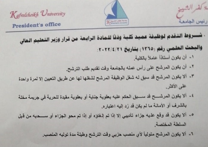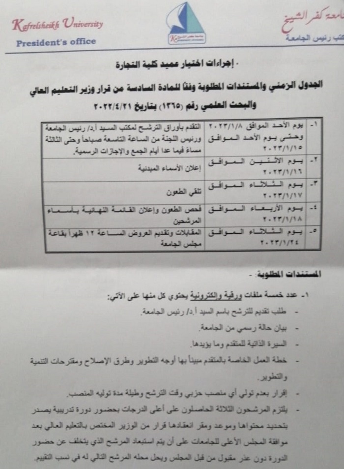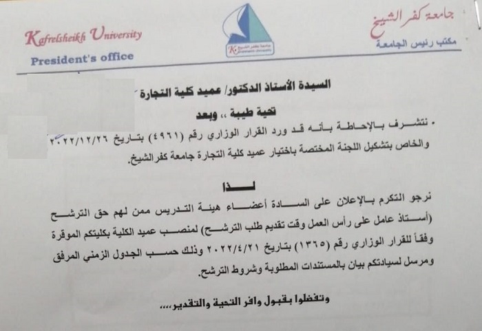 إعلان الترشح لمنصب عميد كلية التجارة جامعة كفر الشيخ