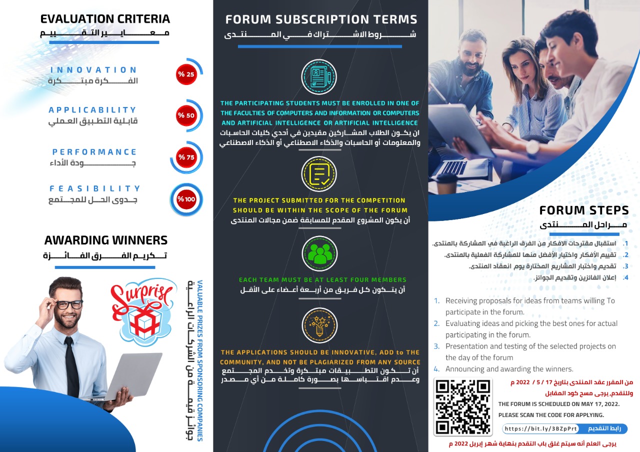 تنظم كلية الحاسبات والمعلومات بالتعاون مع كلية الذكاء الاصطناعي منتدى الحوسبة والذكاء الاصطناعي وذلك بدعم من هيئة تنمية صناعة تكنولوجيا المعلومات "ITIDA" ومعهد تكنولوجيا المعلومات "ITI"التابع لوزارة الاتصالات وتكنولوجيا المعلومات، بمشاركة طلاب وطالبات من كليات الحاسبات والمعلومات والذكاء الاصطناعي بالجامعات المصرية.