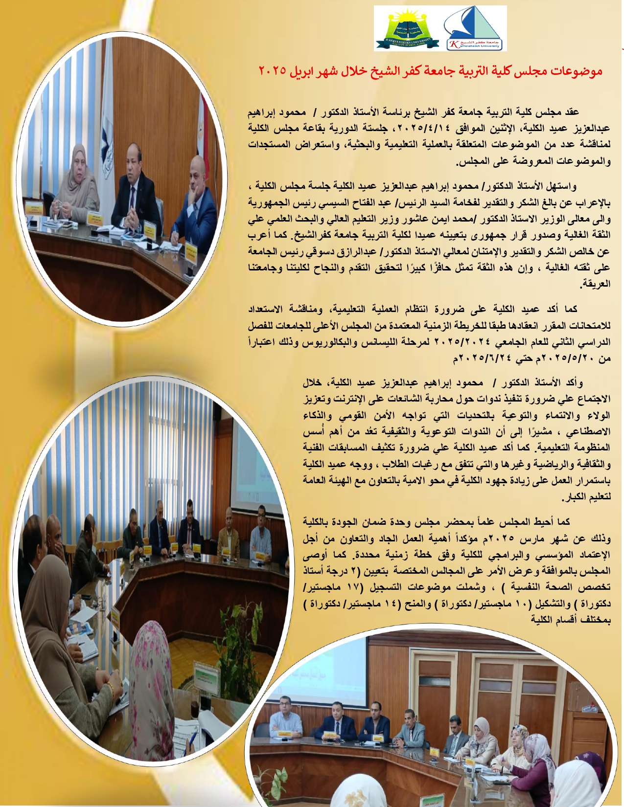 برئاسة الأستاذ الدكتور محمود إبراهيم عبد العزيز مجلس الكلية يعقد جلسته عن شهر أبريل لعام 2025م