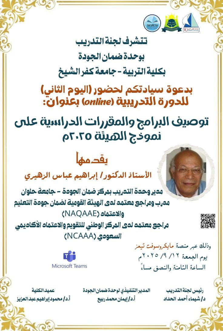 الورشه التدريبية بعنوان " توصيف البرامج والمقررات الدراسية علي نموذج الهيئة٢٠٢٥ " لليوم الثانى اون لاين Online