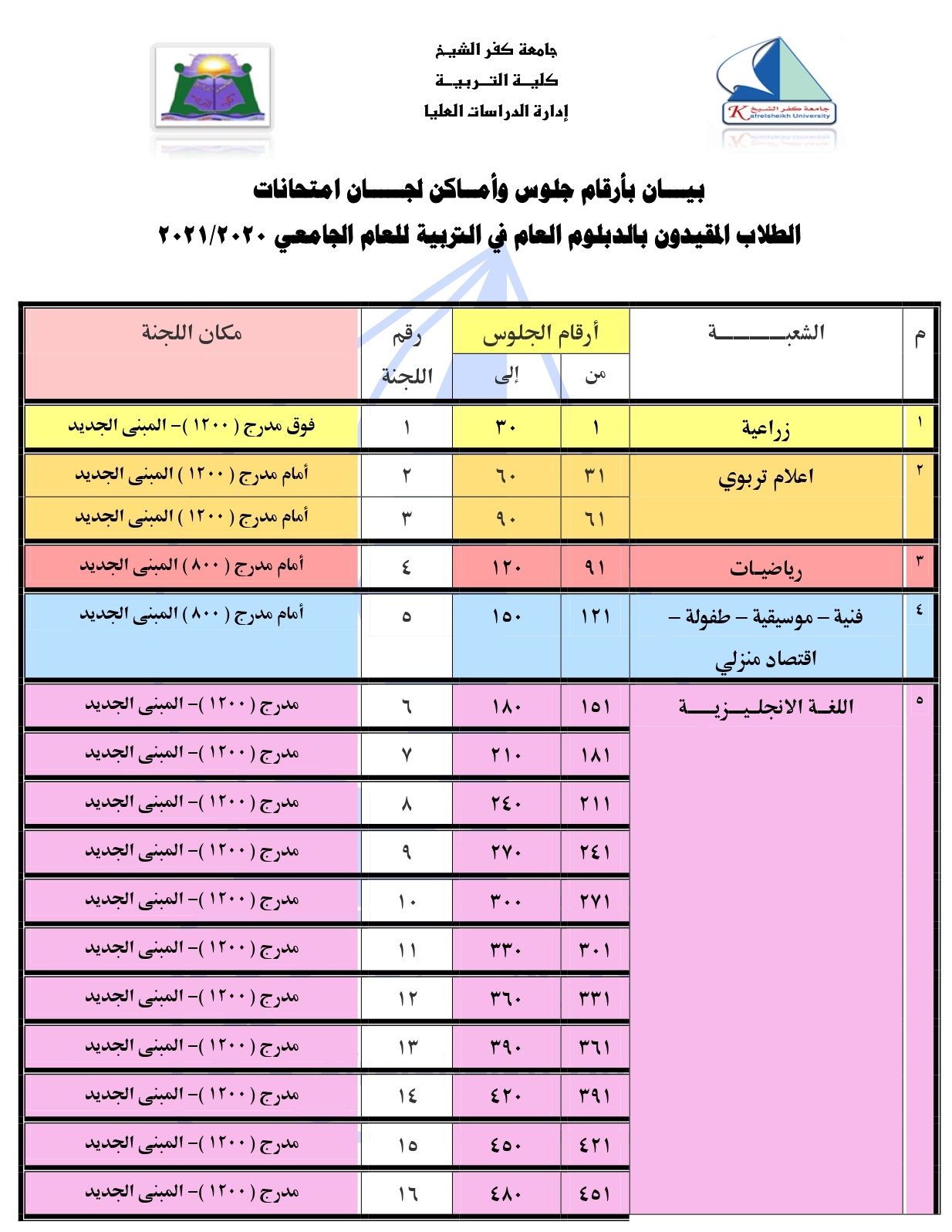 بيـــان بأرقام جلوس وأمــاكن لجـــــان امتحانات الطلاب المقيدون بالدبلوم العام في التربية للعام الجامعي 2020/2021