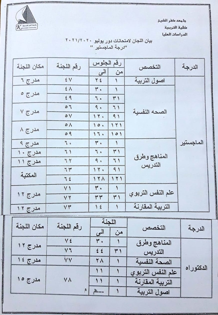 بيـــان بأرقام جلوس وأمــاكن لجـان امتحانات الطلاب المقيدون بالماجستير والدكتوراه في التربية للعام الجامعي 2020/2021