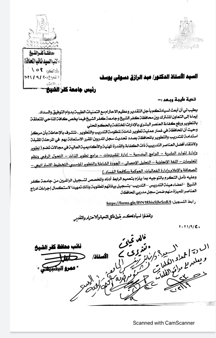 مدربين ومحاضرين من السادة أعضاء هيئة التدريس لرفع كفاءة العنصر البشري بالإدارات المختلفة بالحكم المحلي بالمحافظة