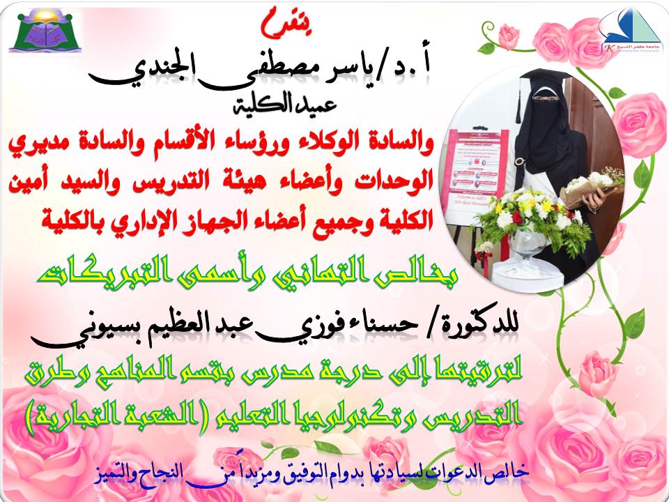 تهنئة الدكتورة/ حسناء فوزي عبد العظيم بسيوني لترقية سيادتها إلي درجة مدرس بقسم المناهج وطرق التدريس وتكنولوجيا التعليم (الشعبة التجارية)