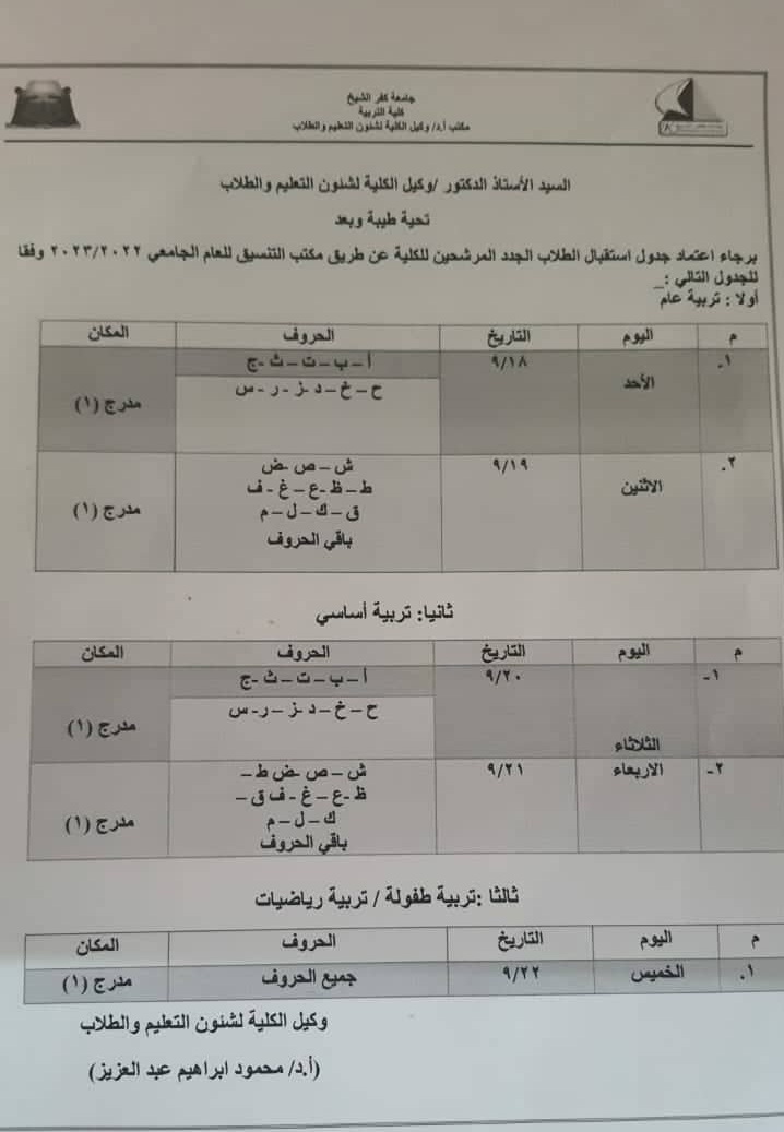 الجدول الزمني لاستقبال الطلاب الجٌدد المرشحين للكلية من قبل مكتب التنسيق للعام الجامعي 2022/2023م