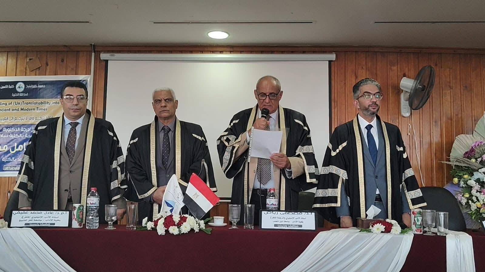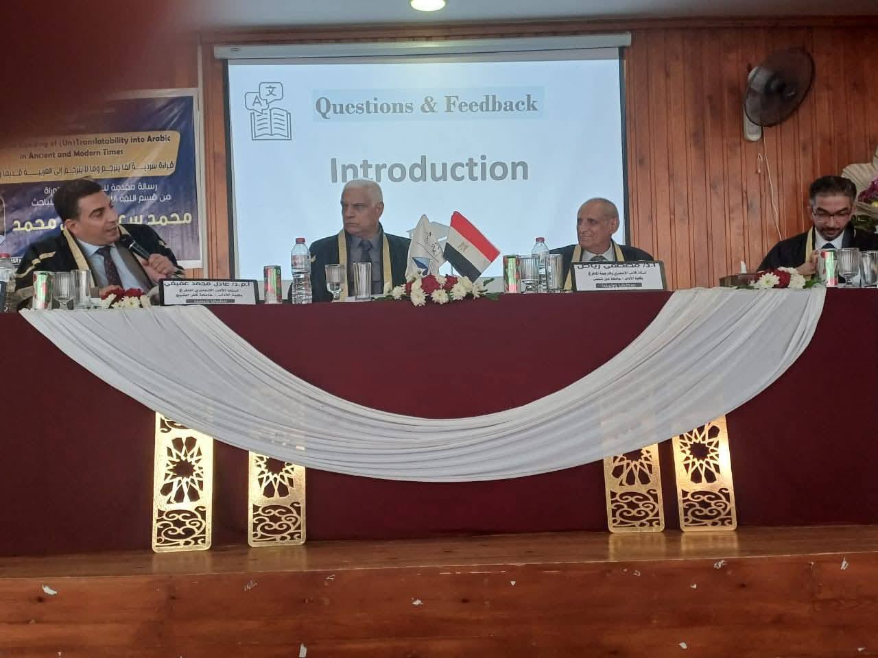 The discussion was also attended by Professor Mustafa Riad, a leading figure in translation studies in Egypt and the Arab world, who praised the high academic standard of the dissertation and its significant contribution to the field of translation studies.