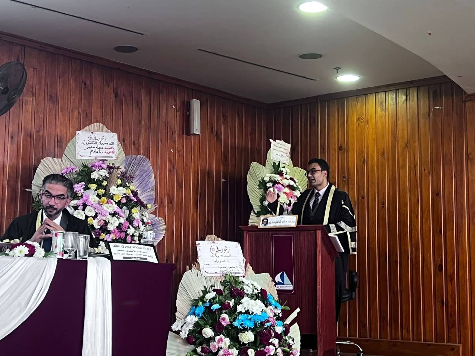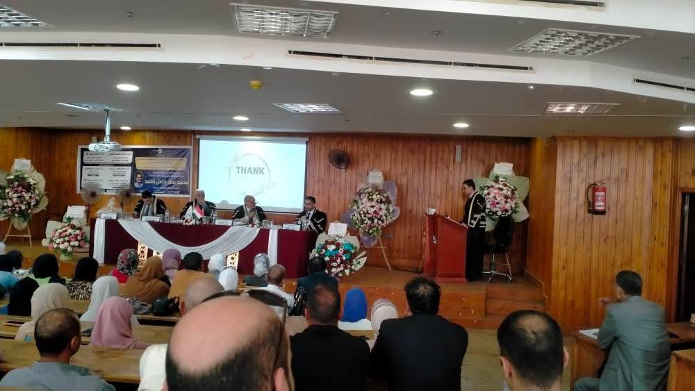 The defense took place under the auspices of Professor Dr. Ismail Ibrahim Ismail, Acting President of the University and Vice President for Graduate Studies and Research, Professor Dr. Abdel Hamid Ghallab, Dean of the Faculty, and Professor Dr. Mosaad Zein El-Abedin, Vice Dean for Graduate Studies and Research. The dissertation was titled:
